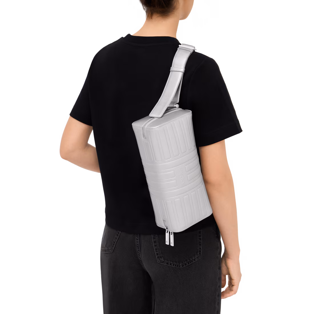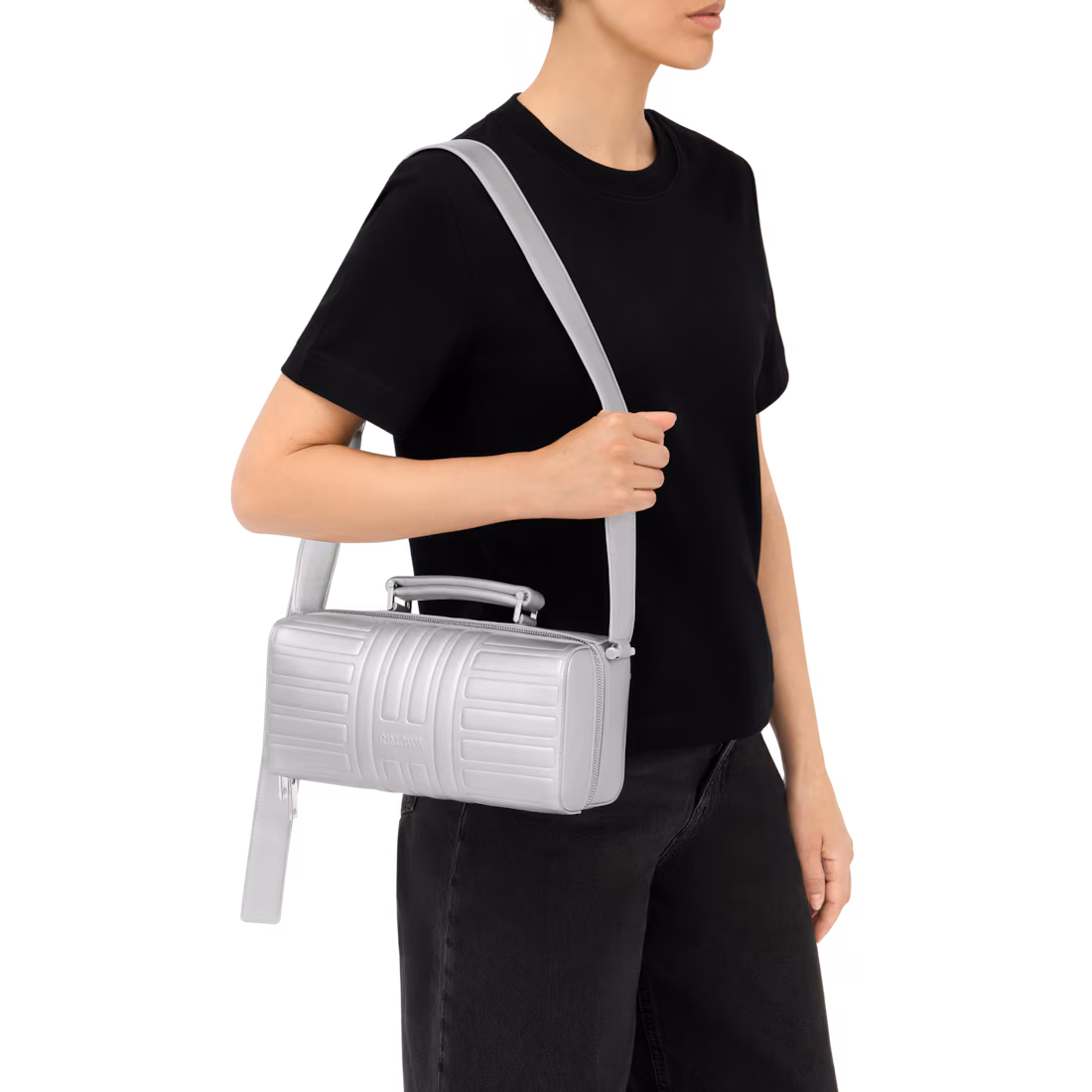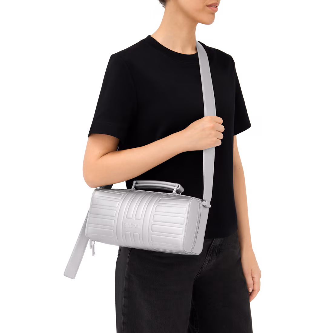 • Длинный регулируемый ремень и ручка, вдохновлённая классическими чемоданами RIMOWA;