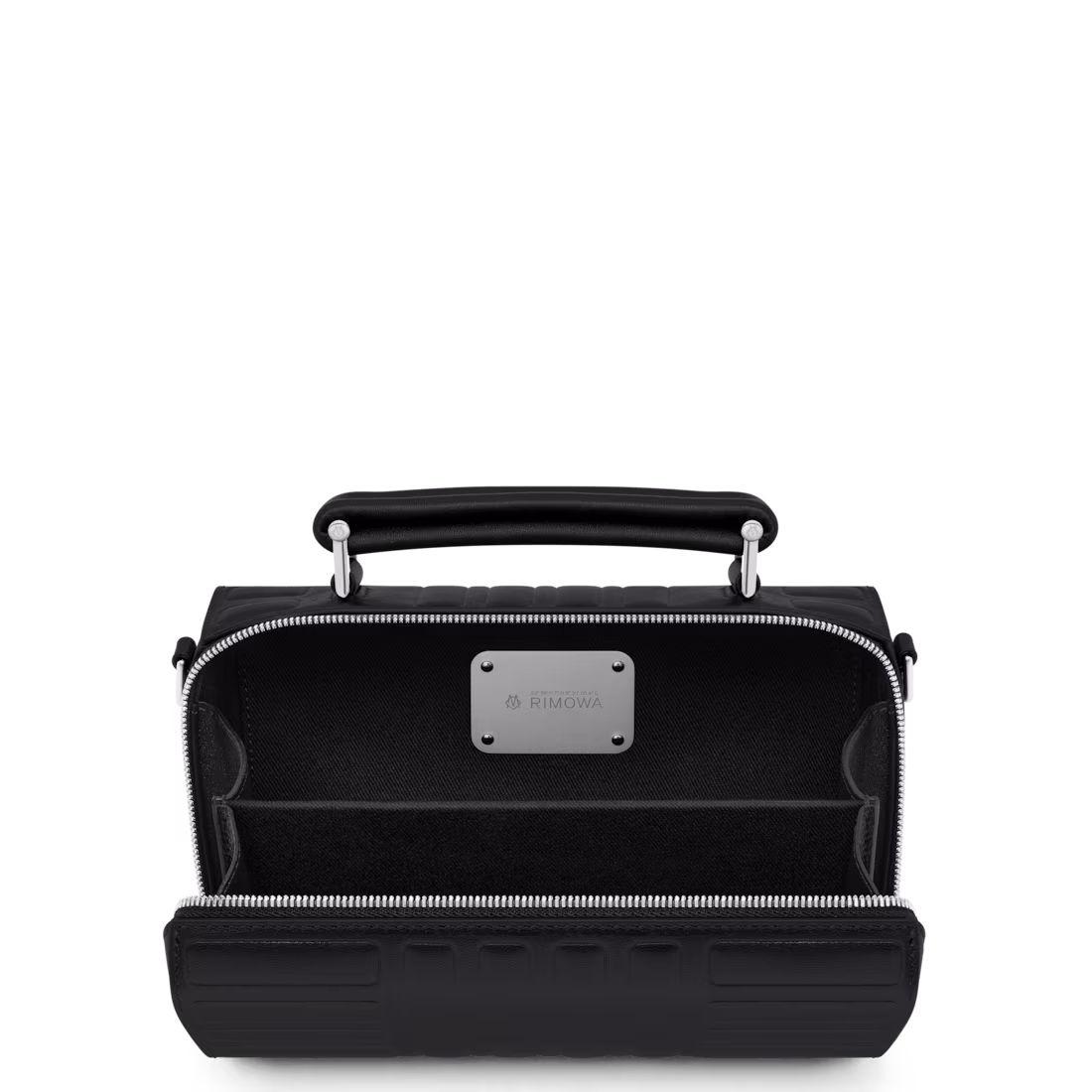 Металлическая пластина, закреплённая четырьмя заклёпками внутри сумки, украшена фирменными деталями RIMOWA — координатами и монограммой, которая перекликается с дизайном наших чемоданов.