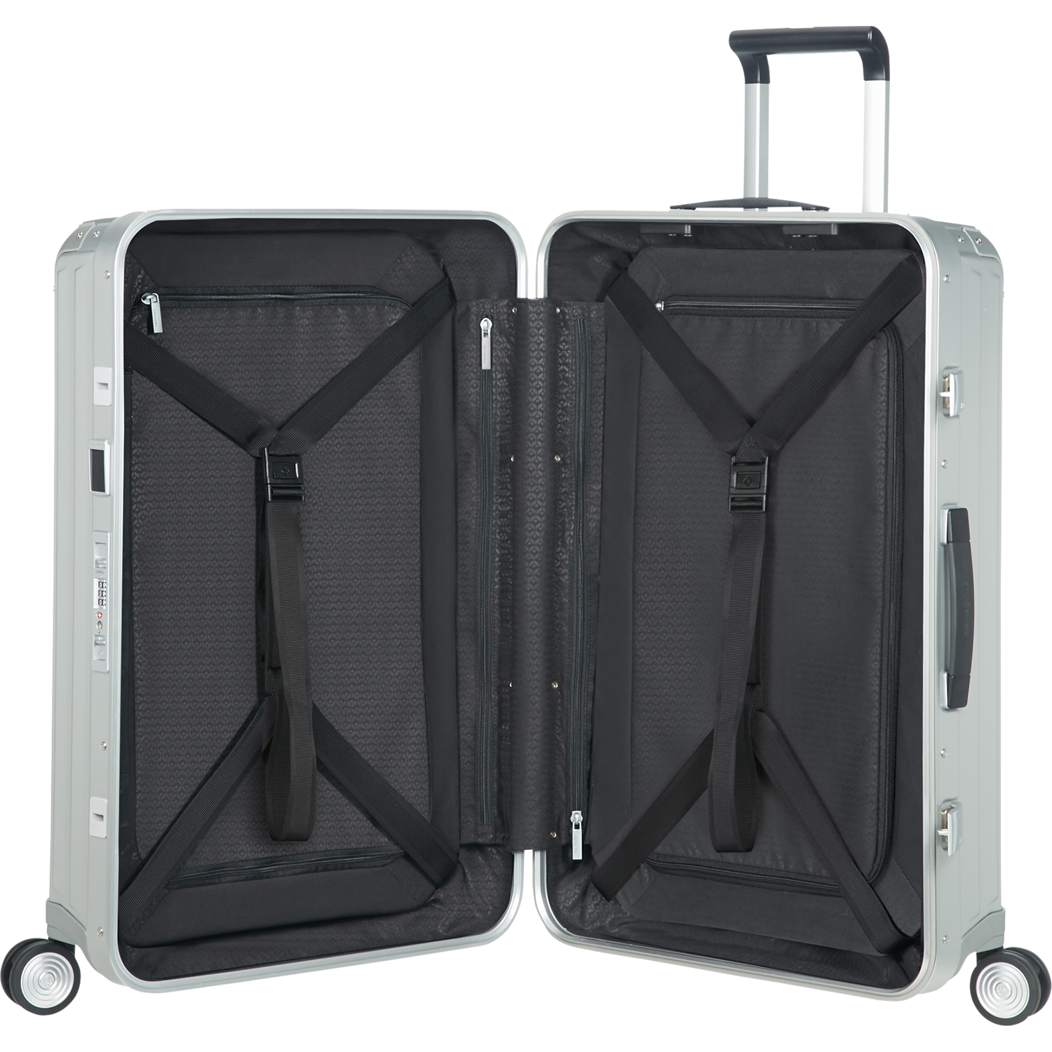 Маневренность, достойная металла: Несмотря на солидность материала, чемодан невероятно подвижен. Система четырех колес Spinner обеспечивает плавное и точное управление даже с полной загрузкой, а надёжная телескопическая ручка работает безупречно.